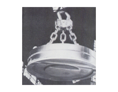 用于吊運大型鋼錠、連鑄板、厚鋼板坯、吊運長度6m以上的板坯時為了避免偏心而產(chǎn)生傾斜,請使用兩臺電磁鐵起吊。